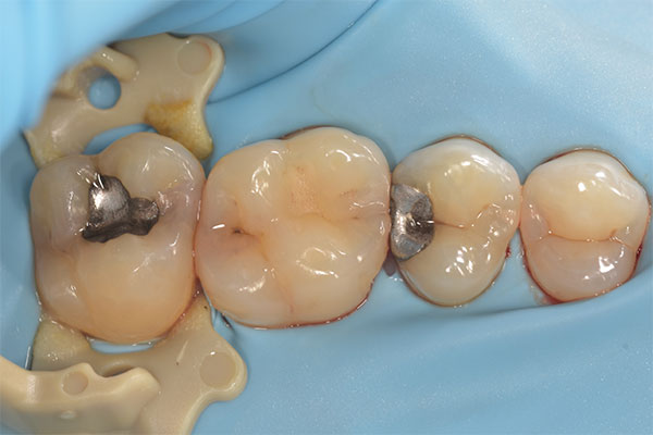 Onlays are frequently used on back teeth. The join is kept as far from the gum line as possible to preserve healthy tooth structure and maintain the tooth strength and vitality. The join may be visible on close inspection but this does not detract from the overall smile as we are selective where we use this technique.